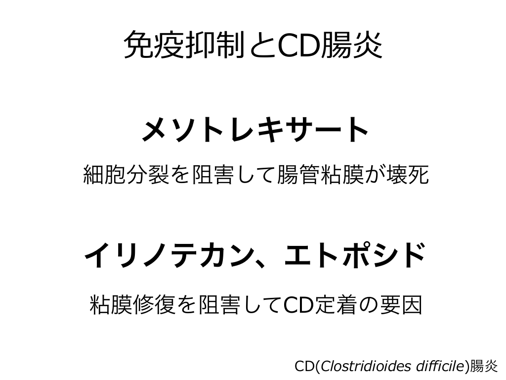 #74. 免疫抑制とCD腸炎 メソトレキサート 細胞分裂を阻害して腸管粘膜が壊死 イリノテカン、エトポシド 粘膜修復を阻害してCD定着の要因 CD(Clostridioides difficile)腸炎