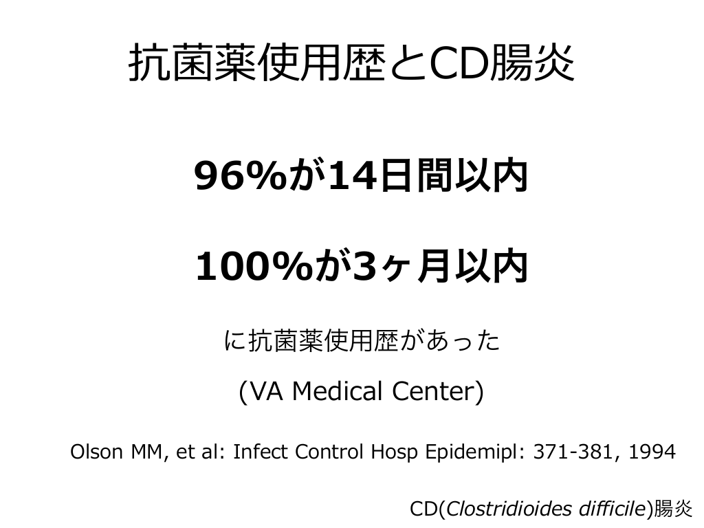 #75. 抗菌薬使⽤歴とCD腸炎 96%が14日間以内 100%が3ヶ月以内 に抗菌薬使用歴があった (VA Medical Center) Olson MM, et al: Infect Control Hosp Epidemipl: 371-381, 1994 CD(Clostridioides difficile)腸炎