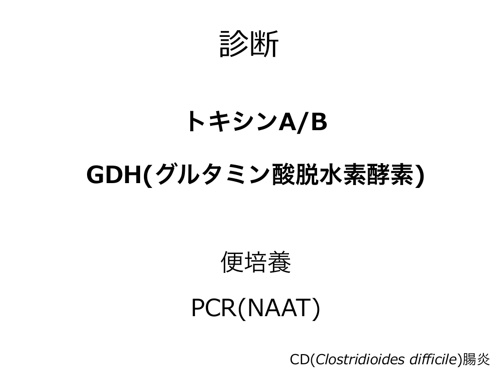 #76. 診断 トキシンA/B GDH(グルタミン酸脱水素酵素) 便培養 PCR(NAAT) CD(Clostridioides difficile)腸炎