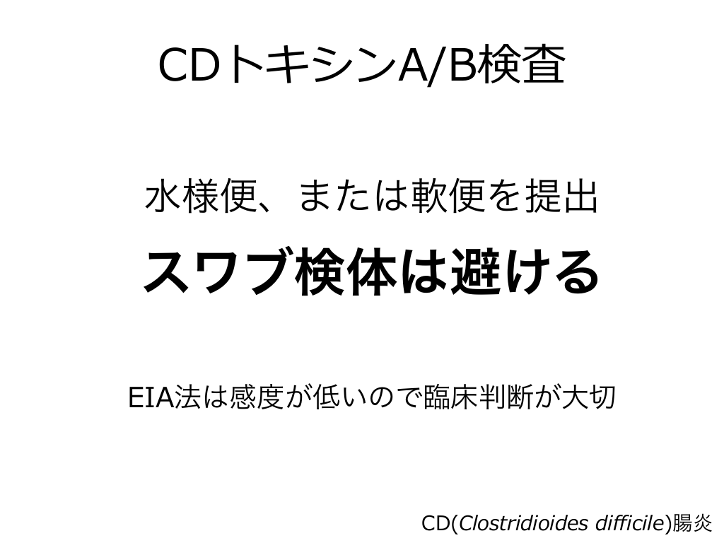 #77. CDトキシンA/B検査 水様便、または軟便を提出 スワブ検体は避ける EIA法は感度が低いので臨床判断が大切 CD(Clostridioides difficile)腸炎