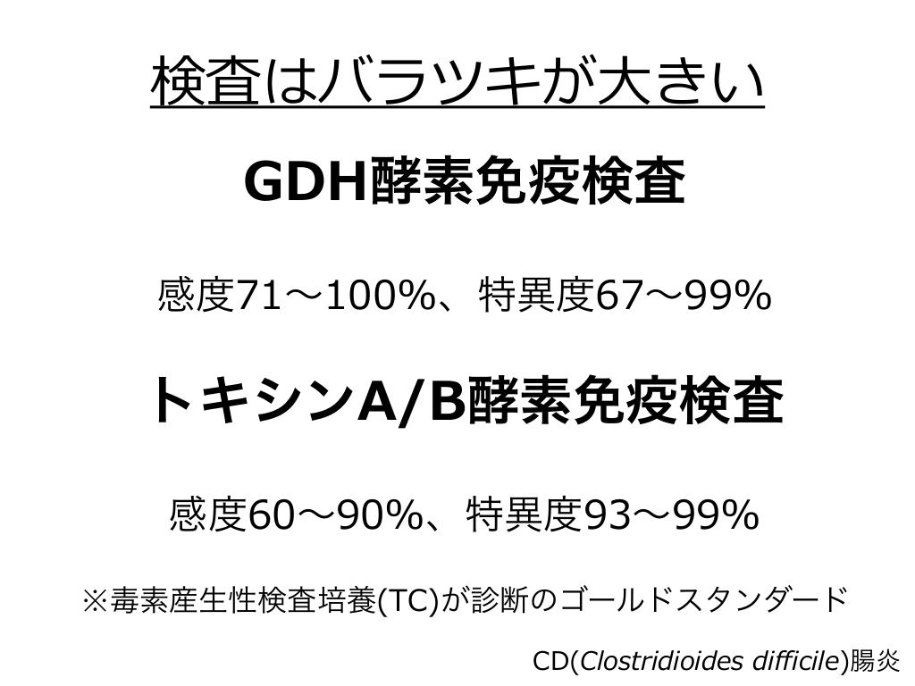 #78. 検査はバラツキが⼤きい GDH酵素免疫検査 感度71〜100%、特異度67〜99% トキシンA/B酵素免疫検査 感度60〜90%、特異度93〜99% ※毒素産生性検査培養(TC)が診断のゴールドスタンダード CD(Clostridioides difficile)腸炎