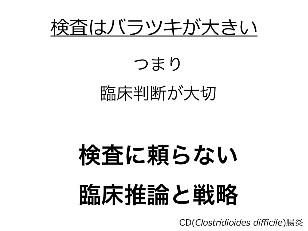 #79. 検査はバラツキが⼤きい つまり 臨床判断が大切 検査に頼らない 臨床推論と戦略 CD(Clostridioides difficile)腸炎