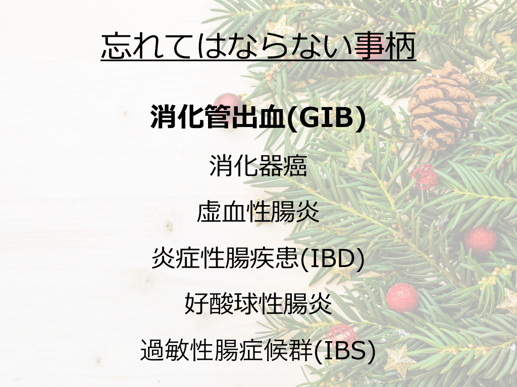 #8. 忘れてはならない事柄 消化管出⾎(GIB) 消化器癌 虚⾎性腸炎 炎症性腸疾患(IBD) 好酸球性腸炎 過敏性腸症候群(IBS)