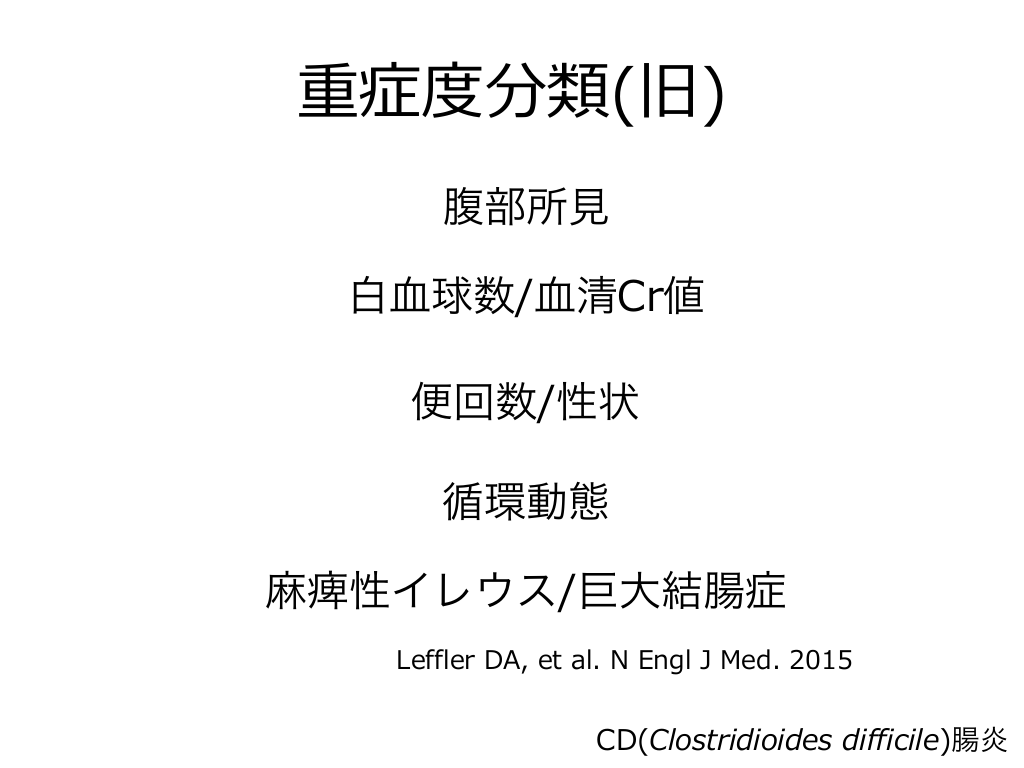 #83. 重症度分類(旧) 腹部所見 白血球数/血清Cr値 便回数/性状 循環動態 麻痺性イレウス/巨大結腸症 Leffler DA, et al. N Engl J Med. 2015 CD(Clostridioides difficile)腸炎