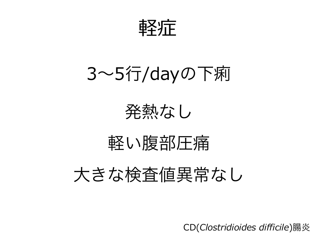 #84. 軽症 3〜5行/dayの下痢 発熱なし 軽い腹部圧痛 大きな検査値異常なし CD(Clostridioides difficile)腸炎