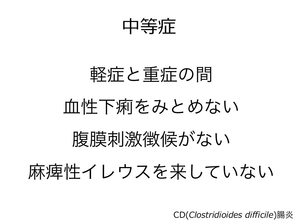 #85. 中等症 軽症と重症の間 血性下痢をみとめない 腹膜刺激徴候がない 麻痺性イレウスを来していない CD(Clostridioides difficile)腸炎