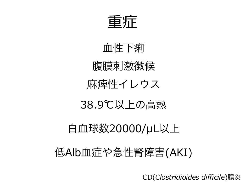 #86. 重症 血性下痢 腹膜刺激徴候 麻痺性イレウス 38.9℃以上の高熱 白血球数20000/μL以上 低Alb血症や急性腎障害(AKI) CD(Clostridioides difficile)腸炎