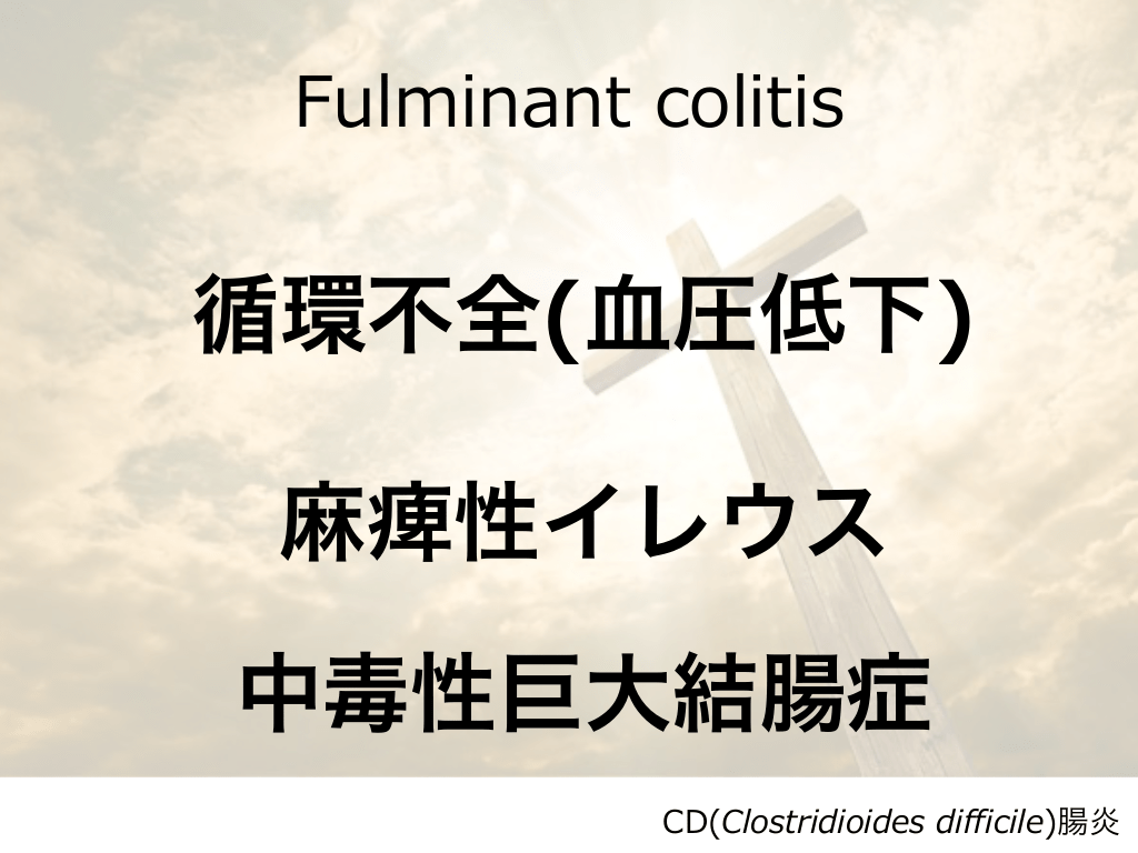 #90. Fulminant colitis 循環不全(血圧低下) 麻痺性イレウス 中毒性巨大結腸症 CD(Clostridioides difficile)腸炎