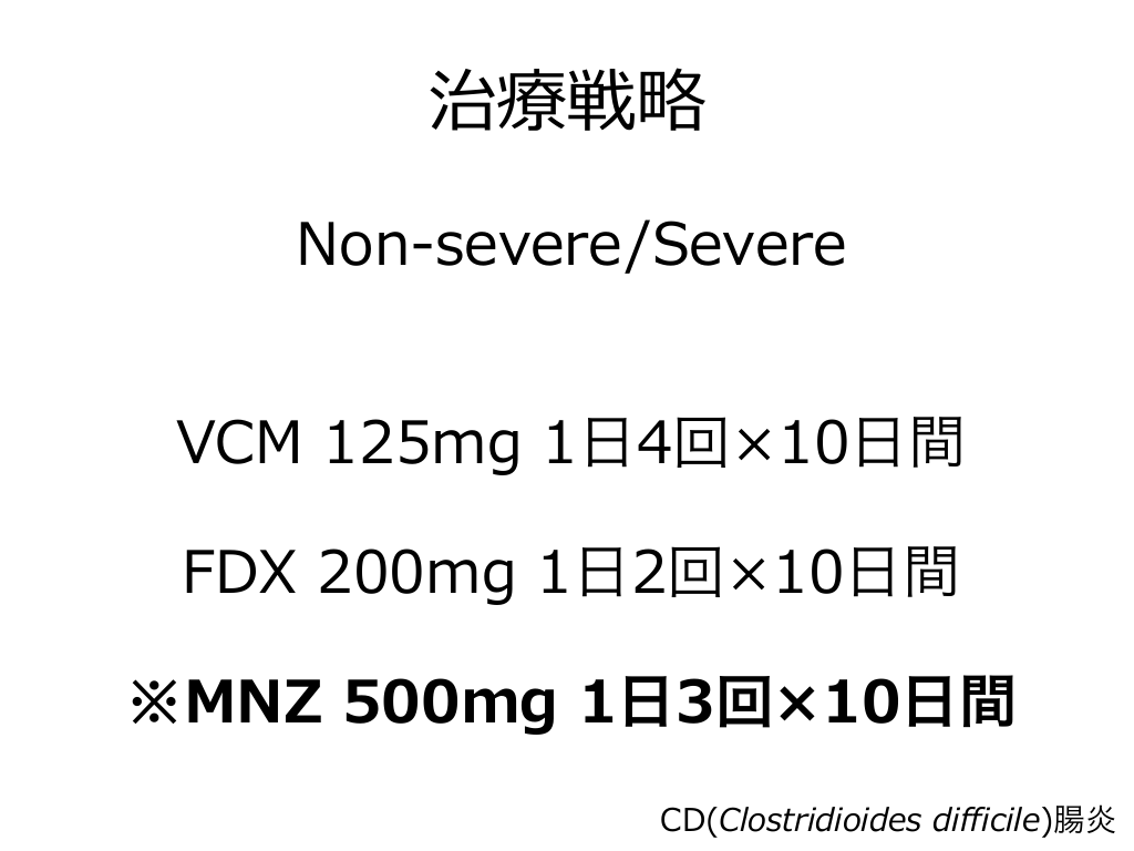 #91. 治療戦略 Non-severe/Severe VCM 125mg 1日4回×10日間 FDX 200mg 1日2回×10日間 ※MNZ 500mg 1日3回×10日間 CD(Clostridioides difficile)腸炎