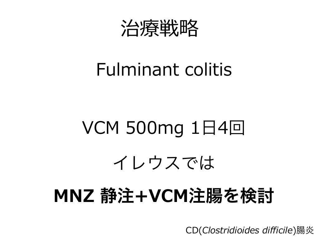 #92. 治療戦略 Fulminant colitis VCM 500mg 1日4回 イレウスでは MNZ 静注+VCM注腸を検討 CD(Clostridioides difficile)腸炎