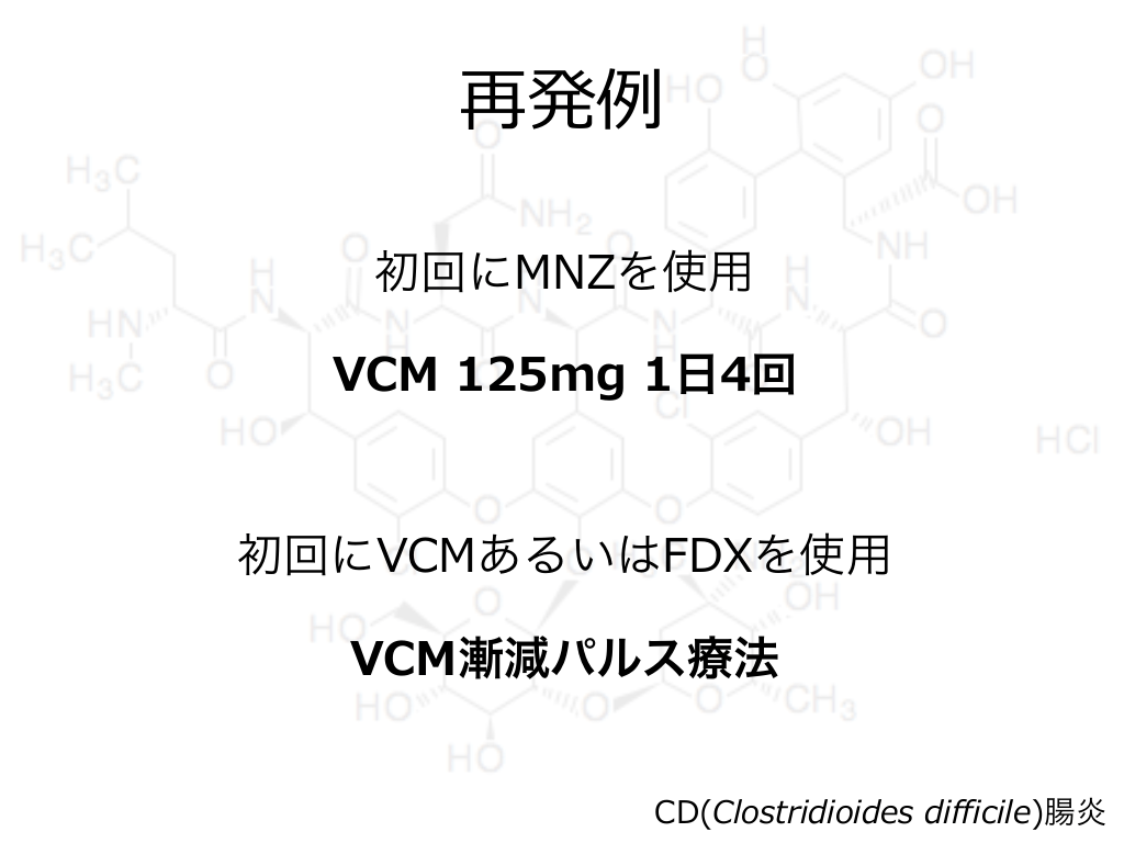 #93. 再発例 初回にMNZを使用 VCM 125mg 1日4回 初回にVCMあるいはFDXを使用 VCM漸減パルス療法 CD(Clostridioides difficile)腸炎