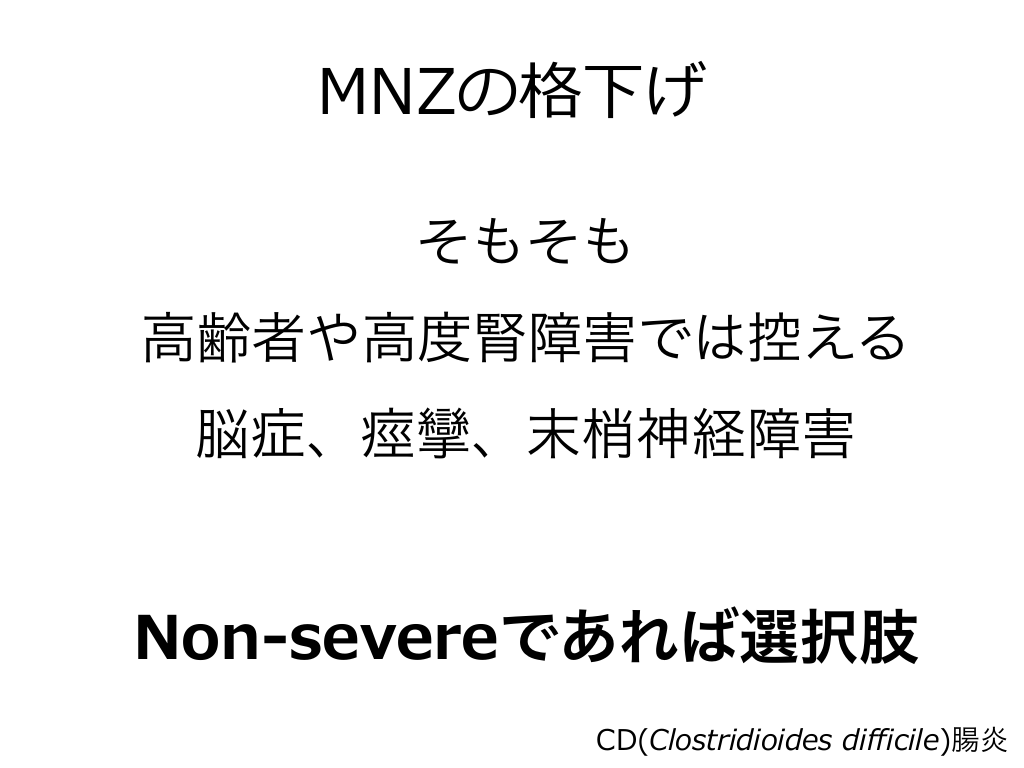 #94. MNZの格下げ そもそも 高齢者や高度腎障害では控える 脳症、痙攣、末梢神経障害 Non-severeであれば選択肢 CD(Clostridioides difficile)腸炎