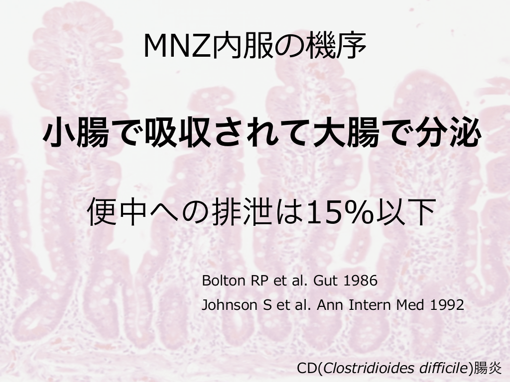 #95. MNZ内服の機序 小腸で吸収されて大腸で分泌 便中への排泄は15%以下 Bolton RP et al. Gut 1986 Johnson S et al. Ann Intern Med 1992 CD(Clostridioides difficile)腸炎