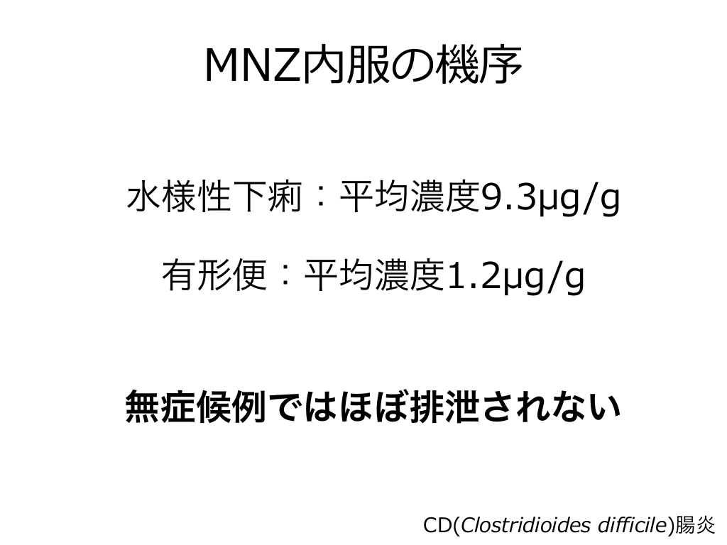 #96. MNZ内服の機序 水様性下痢:平均濃度9.3μg/g 有形便:平均濃度1.2μg/g 無症候例ではほぼ排泄されない CD(Clostridioides difficile)腸炎