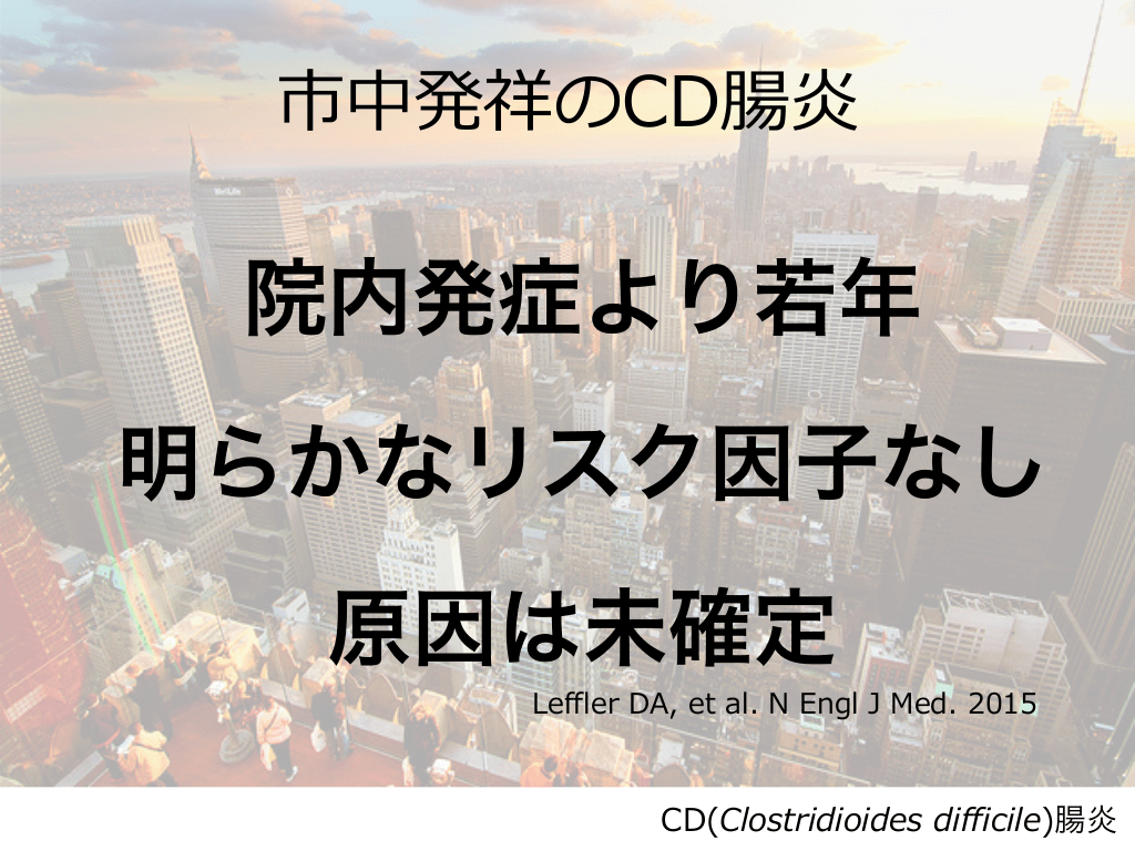 #97. 市中発祥のCD腸炎 院内発症より若年 明らかなリスク因子なし 原因は未確定 Leffler DA, et al. N Engl J Med. 2015 CD(Clostridioides difficile)腸炎