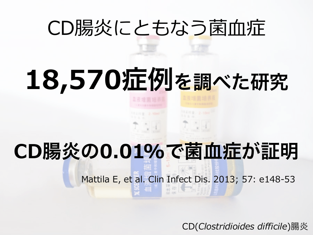 #98. CD腸炎にともなう菌⾎症 18,570症例を調べた研究 CD腸炎の0.01%で菌血症が証明 Mattila E, et al. Clin Infect Dis. 2013; 57: e148-53 CD(Clostridioides difficile)腸炎