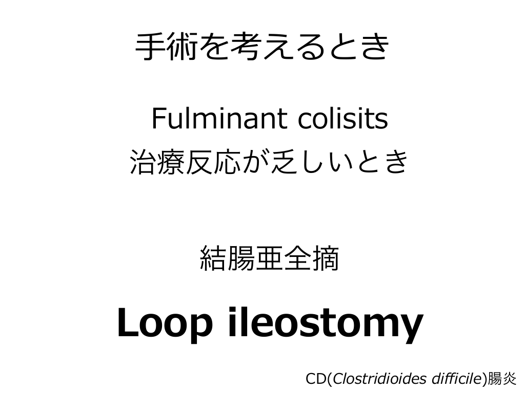 #99. ⼿術を考えるとき Fulminant colisits 治療反応が乏しいとき 結腸亜全摘 Loop ileostomy CD(Clostridioides difficile)腸炎