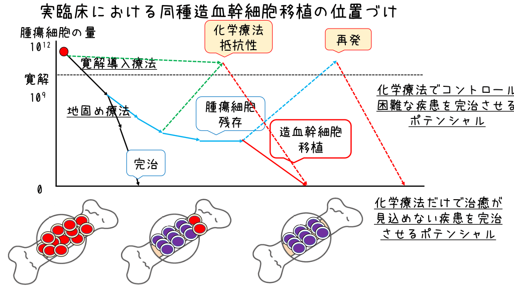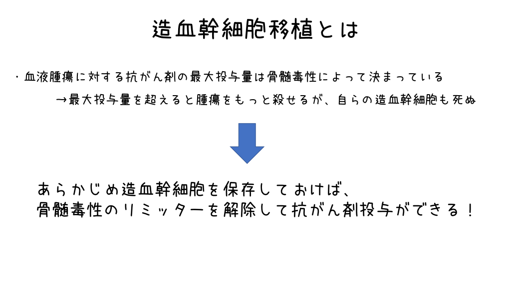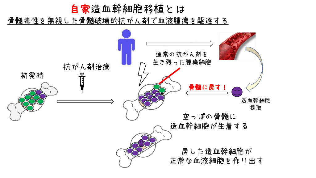 6. 血液細胞は抗がん剤感受性が高いので、骨髄毒性が一番の副作用。規定量を超えての投与はもっともっと血液がんを殺せるが、自分の血液細胞も大ダメージをおって、場合によっては造血システムが破綻する。ここで、造血幹細胞がストックしてあれば、造血幹細胞を体に戻してあげることで造血が再生する。つまり、骨髄毒性というリミッターを無視して、とんでもない量の抗がん剤を入れて血液がんをころすことができる。