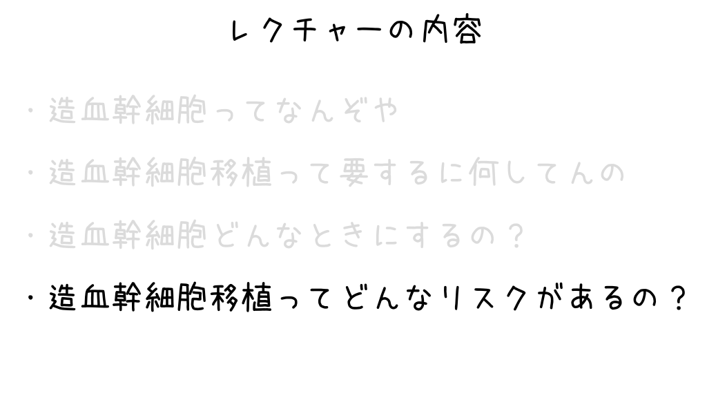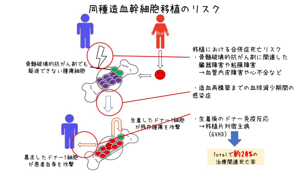 13. リスクは①抗がん剤の副作用、②血球減少期の感染症、③生着後のGVHDが主なところで、total 20%の患者が死亡するというハイリスクな治療