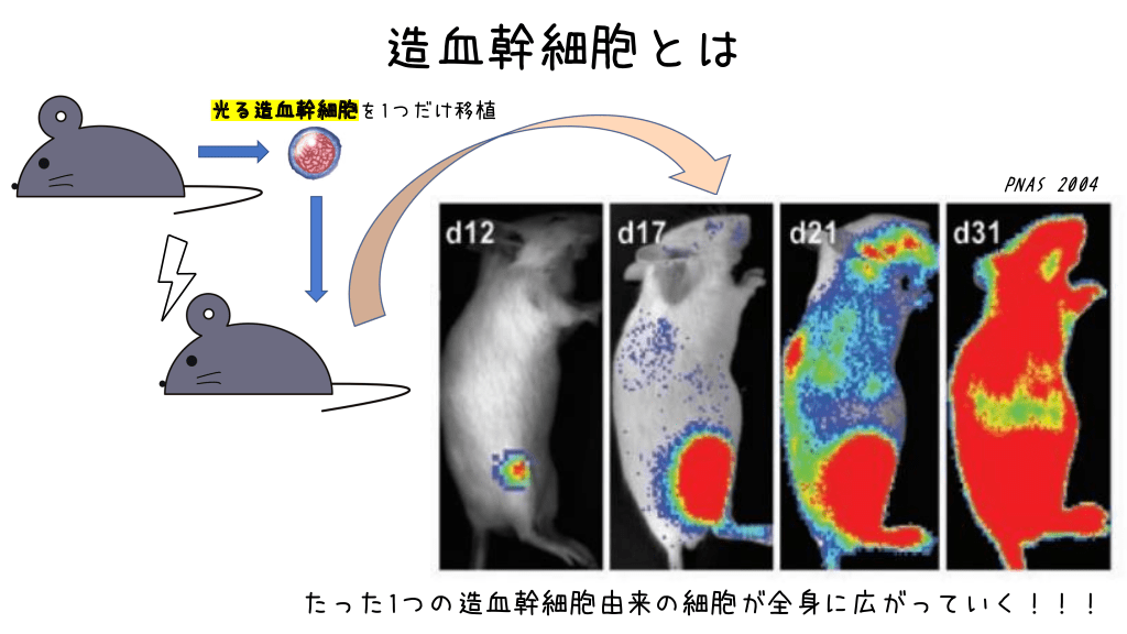 3. マウスでは、たった1つの幹細胞の移植によって造血再構築することが証明されている。すなわち、造血幹細胞は自己複製能と多分化能をもつ。