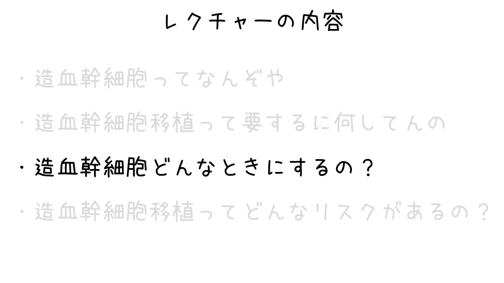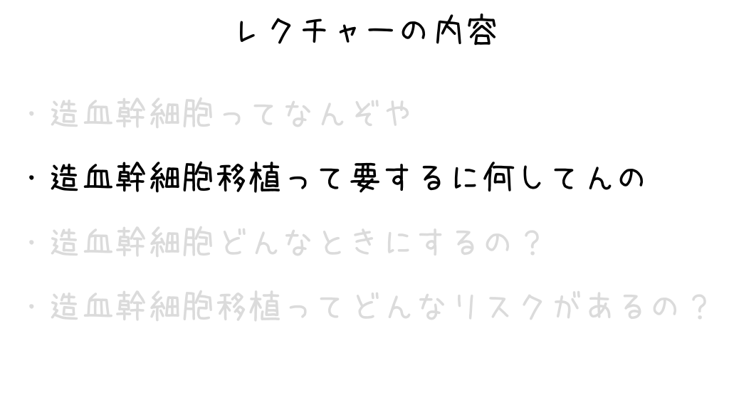 血液内科ローテ中の研修医/医学生や血液内科勉強中の方向けの造血幹細胞移植の解説動画です。