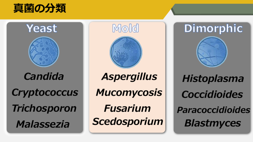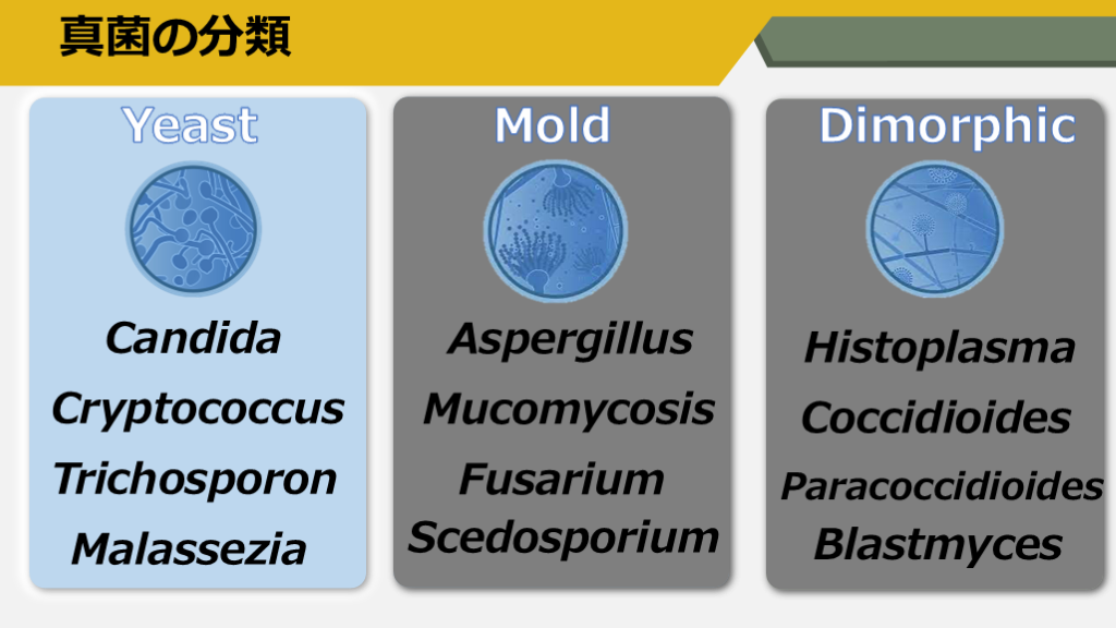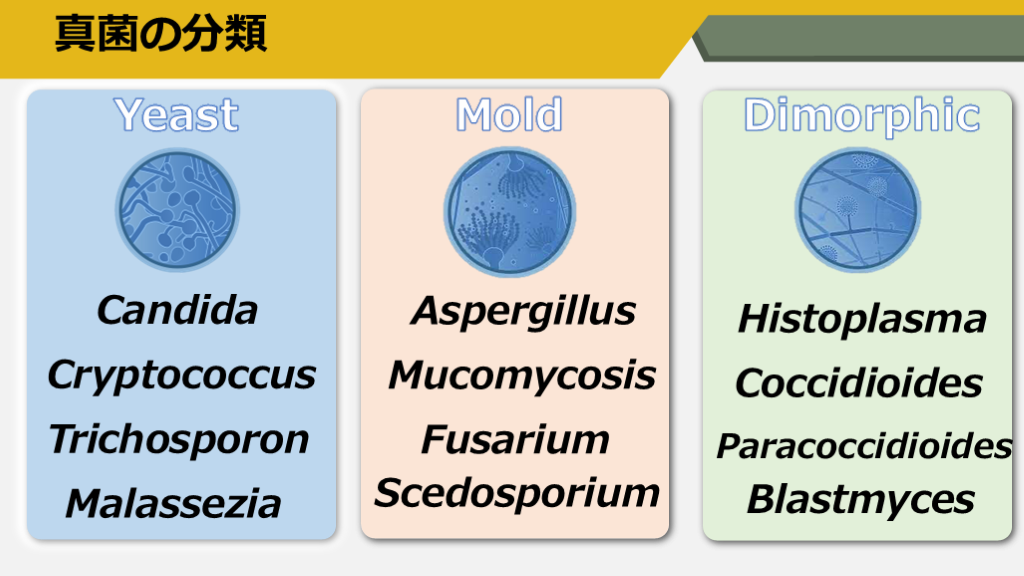 #3. 真菌の分類 Yeast Mold Dimorphic Candida Cryptococcus Trichosporon Malassezia Aspergillus Mucomycosis Fusarium Scedosporium Histoplasma Coccidioides Paracoccidioides Blastmyces