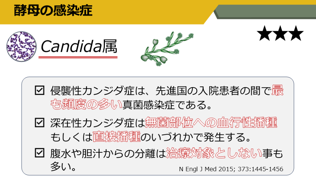 #5. Candida属 侵襲性カンジダ症は、先進国の入院患者の間で最も頻度の多い真菌感染症である。 深在性カンジダ症は無菌部位への血行性播種もしくは直接播種のいづれかで発生する。 腹水や胆汁からの分離は治療対象としない事も多い。 N Engl J Med 2015; 373:1445-1456 酵母の感染症