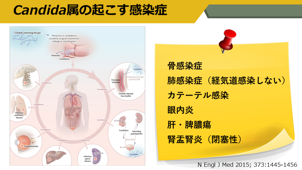 #7. 骨感染症 肺感染症(経気道感染しない) カテーテル感染 眼内炎 肝・脾膿瘍 腎盂腎炎(閉塞性) Candida属の起こす感染症 N Engl J Med 2015; 373:1445-1456