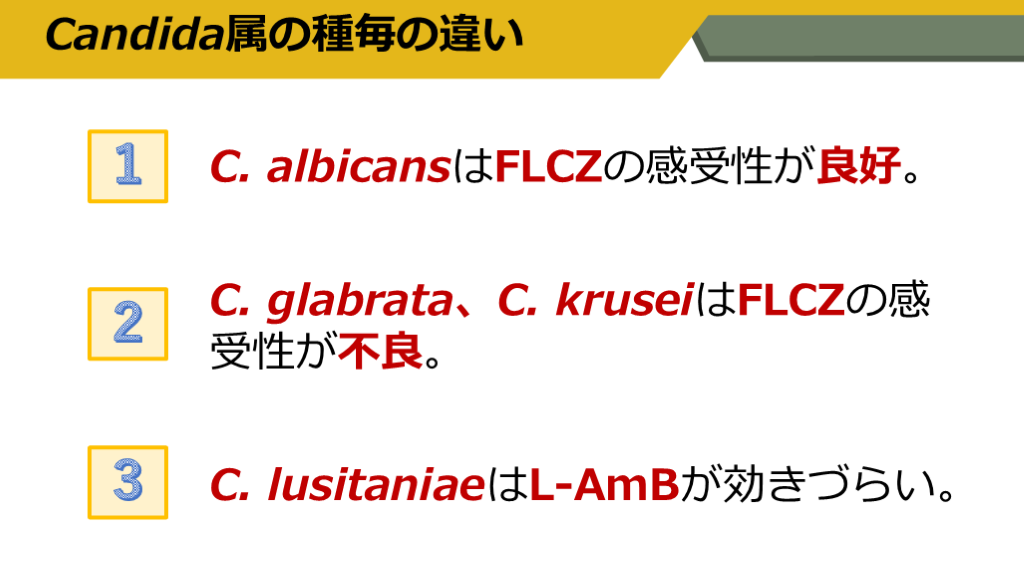#11. Candida属の種毎の違い 1 2 3 C. albicansはFLCZの感受性が良好。 C. glabrata、C. kruseiはFLCZの感受性が不良。 C. lusitaniaeはL-AmBが効きづらい。
