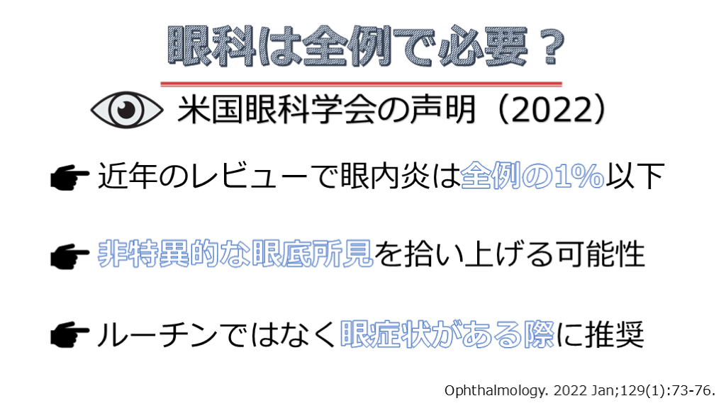 近年のレビューで眼内炎は全例の1%以下 米国眼科学会の声明(2022) 非特異的な眼底所見を拾い上げる可能性 ルーチンではなく眼症状がある際に推奨