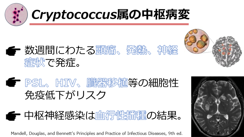 #21. Cryptococcus属の中枢病変 数週間にわたる頭痛、発熱、神経症状で発症。 PSL、HIV、臓器移植等の細胞性