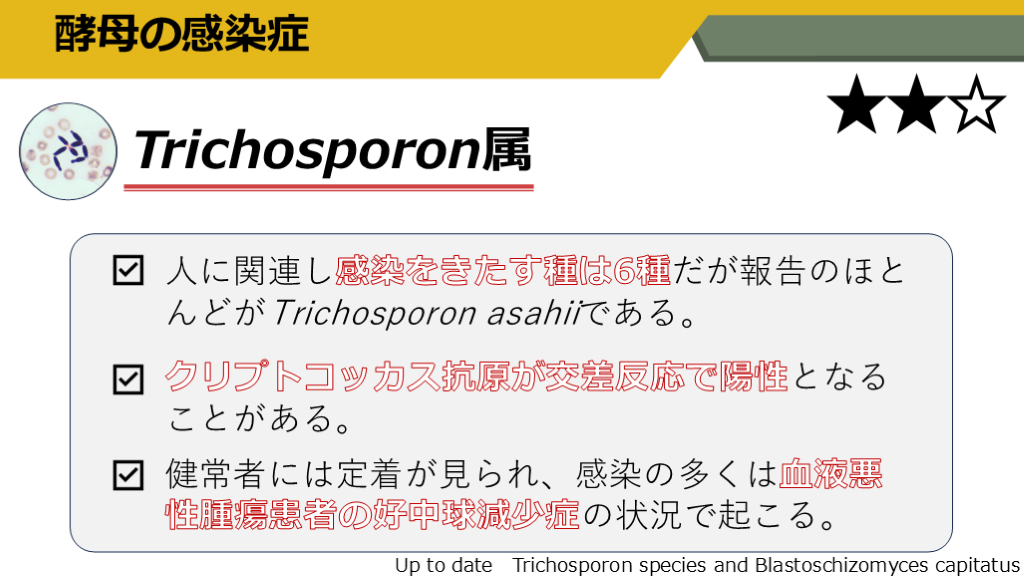 #24. 酵母の感染症 Trichosporon属 人に関連し感染をきたす種は6種だが報告のほとんどがTrichosporon asahiiである。 クリプトコッカス抗原が交差反応で陽性となることがある。 健常者には定着が見られ、感染の多くは血液悪性腫瘍患者の好中球減少症の状況で起こる。 Up to date Trichosporon species and Blastoschizomyces capitatus