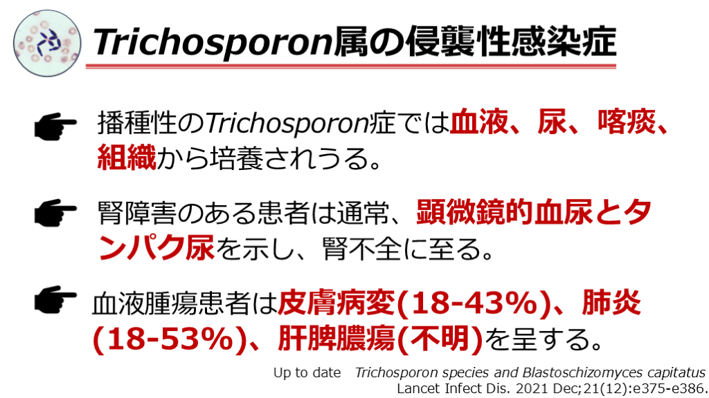 #26. Trichosporon属の侵襲性感染症 播種性のTrichosporon症では血液、尿、喀痰、組織から培養されうる。 腎障害のある患者は通常、顕微鏡的血尿とタンパク尿を示し、腎不全に至る。 血液腫瘍患者は皮膚病変(18-43%)、肺炎(18-53%)、肝脾膿瘍(不明)を呈する。 Up to date Trichosporon species and Blastoschizomyces capitatus Lancet Infect Dis. 2021 Dec;21(12):e375-e386.