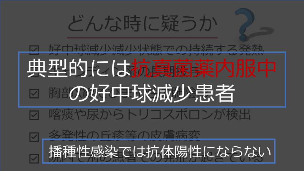 #28. どんな時に疑うか 好中球減少減少状態での持続する発熱 キャンディン系の長期投与 多発性の丘疹等の皮膚病変 胸部X線でびまん性の肺陰影 喀痰や尿からトリコスポロンが検出 院内で別の患者での発症が起きている 典型的には抗真菌薬内服中