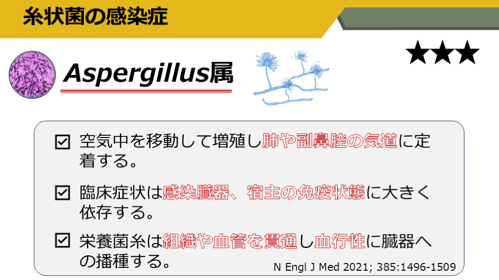 #32. Aspergillus属 空気中を移動して増殖し肺や副鼻腔の気道に定着する。 糸状菌の感染症 臨床症状は感染臓器、宿主の免疫状態に大きく依存する。 栄養菌糸は組織や血管を貫通し血行性に臓器への播種する。 N Engl J Med 2021; 385:1496-1509