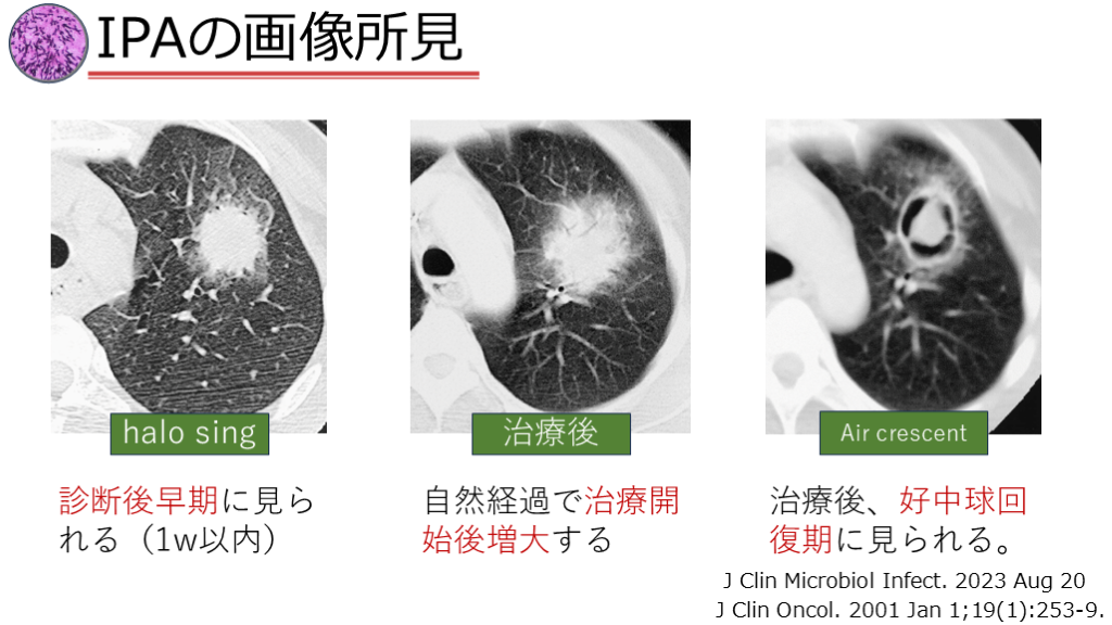 halo sing Air crescent 治療後 診断後早期に見られる(1w以内) 自然経過で治療開始後増大する 治療後、好中球回復期に見られる。 J Clin Microbiol Infect. 2023 Aug 20