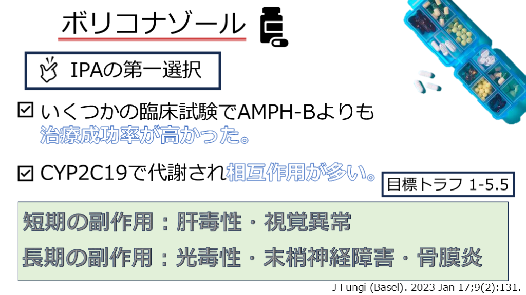 治療成功率が高かった。 短期の副作用:肝毒性・視覚異常 長期の副作用:光毒性・末梢神経障害・骨膜炎 IPAの第一選択 目標トラフ 1-5.5 CYP2C19で代謝され相互作用が多い。 J Fungi (Basel). 2023 Jan 17;9(2):131.