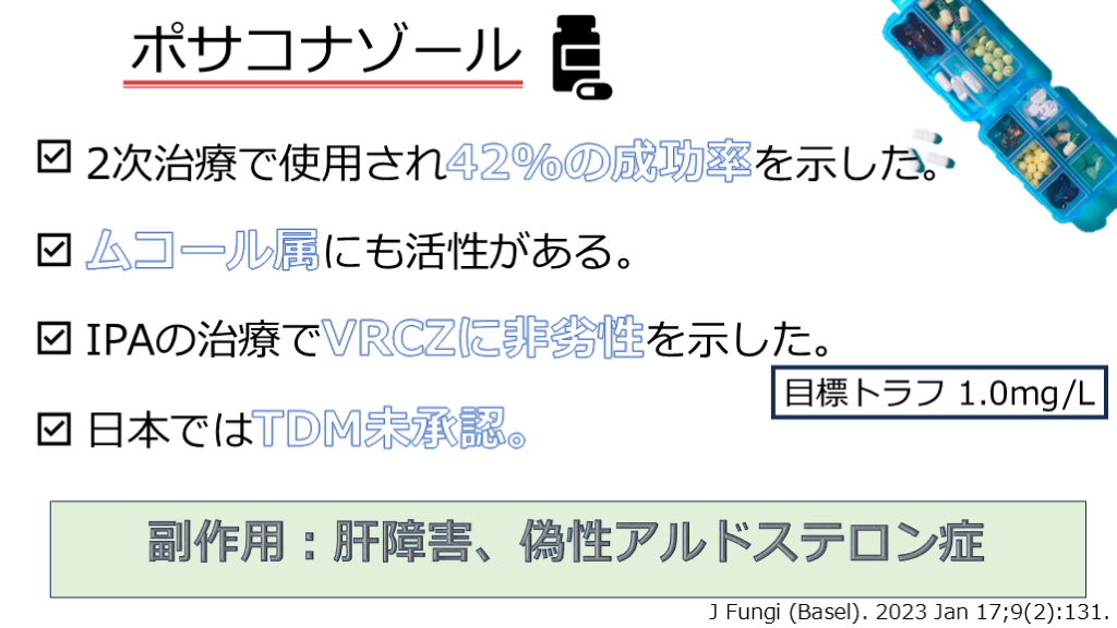 #44. ポサコナゾール 2次治療で使用され42%の成功率を示した。 副作用:肝障害、偽性アルドステロン症 目標トラフ 1.0mg/L ムコール属にも活性がある。 J Fungi (Basel). 2023 Jan 17;9(2):131. IPAの治療でVRCZに非劣性を示した。 日本ではTDM未承認。