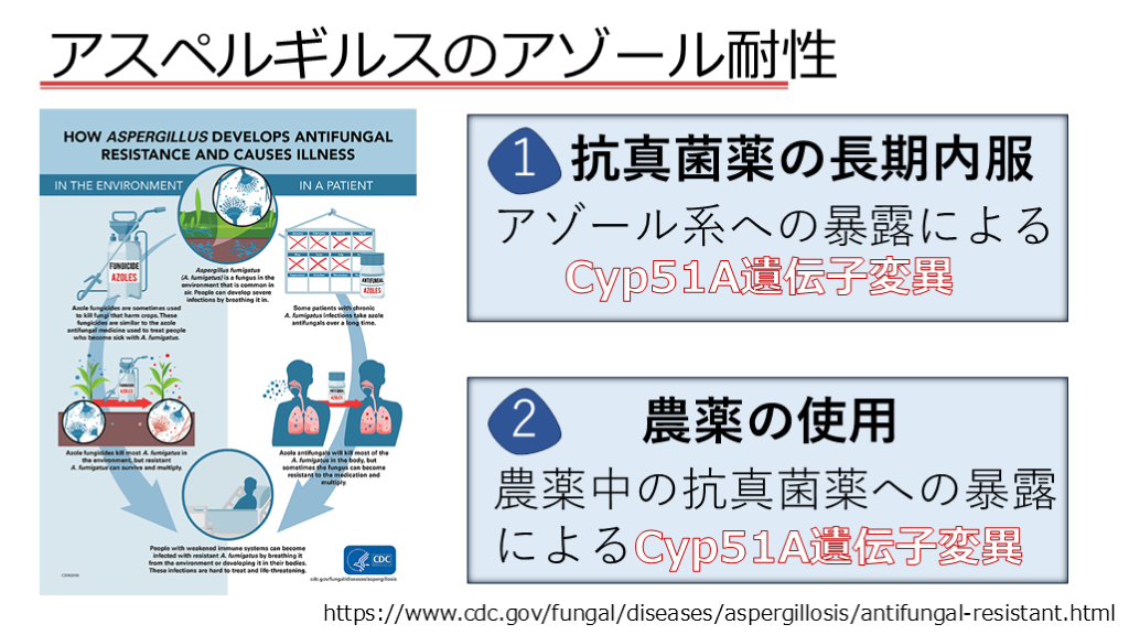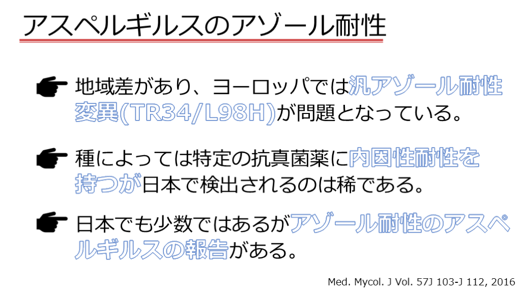 変異(TR34/L98H)が問題となっている。 日本でも少数ではあるがアゾール耐性のアスペ