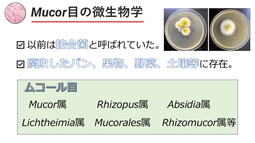 #48. Mucor目の微生物学 以前は接合菌と呼ばれていた。 腐敗したパン、果物、野菜、土壌等に存在。 ムコール目 Mucor属 Rhizopus属 Lichtheimia属 Mucorales属 Rhizomucor属等 Absidia属