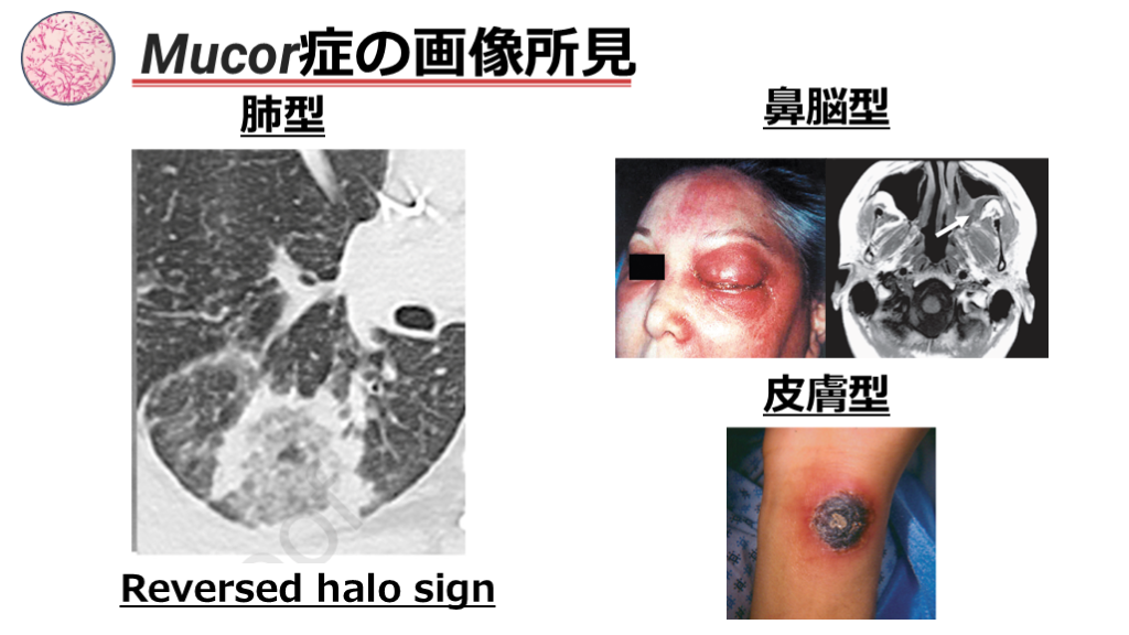 #51. Mucor症の画像所見 Reversed halo sign 肺型 鼻脳型 皮膚型