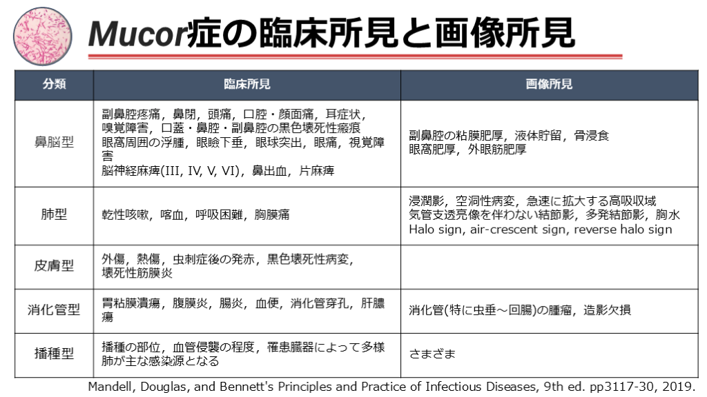 #52. Mandell, Douglas, and Bennett's Principles and Practice of Infectious Diseases, 9th ed. pp3117-30, 2019. Mucor症の臨床所見と画像所見