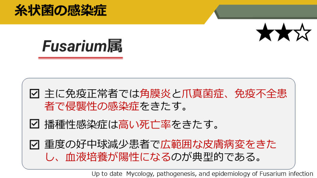 #55. Fusarium属の微生物学 300種以上存在するが病原性を持つのはわずかである。 Fsarium solaniが人の感染症の大多数を占める。 Up to date Mycology, pathogenesis, and epidemiology of Fusarium infection