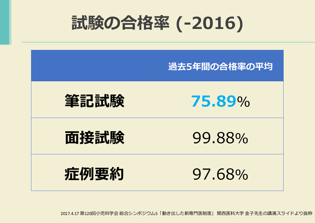 #11. 試験の合格率 (-2016) 過去5年間の合格率の平均 筆記試験 75.89% 面接試験 99.88% 症例要約 97.68% 2017.4.17 第120回小児科学会 総合シンポジウム5「動き出した新専門医制度」 関西医科大学 金子先生の講演スライドより抜粋