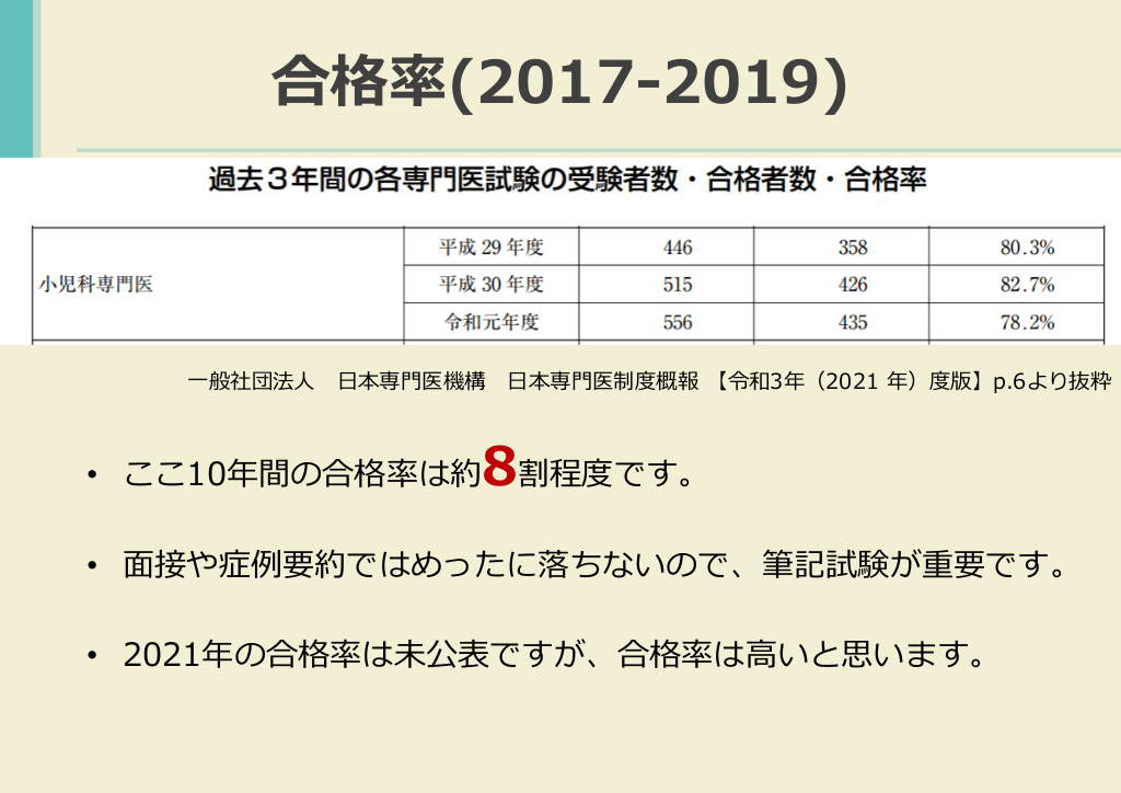 #12. 合格率(2017-2019) 一般社団法人 日本専門医機構 • ここ10年間の合格率は約 日本専門医制度概報 【令和3年(2021 年)度版】p.6より抜粋 8割程度です。 • 面接や症例要約ではめったに落ちないので、筆記試験が重要です。 • 2021年の合格率は未公表ですが、合格率は高いと思います。