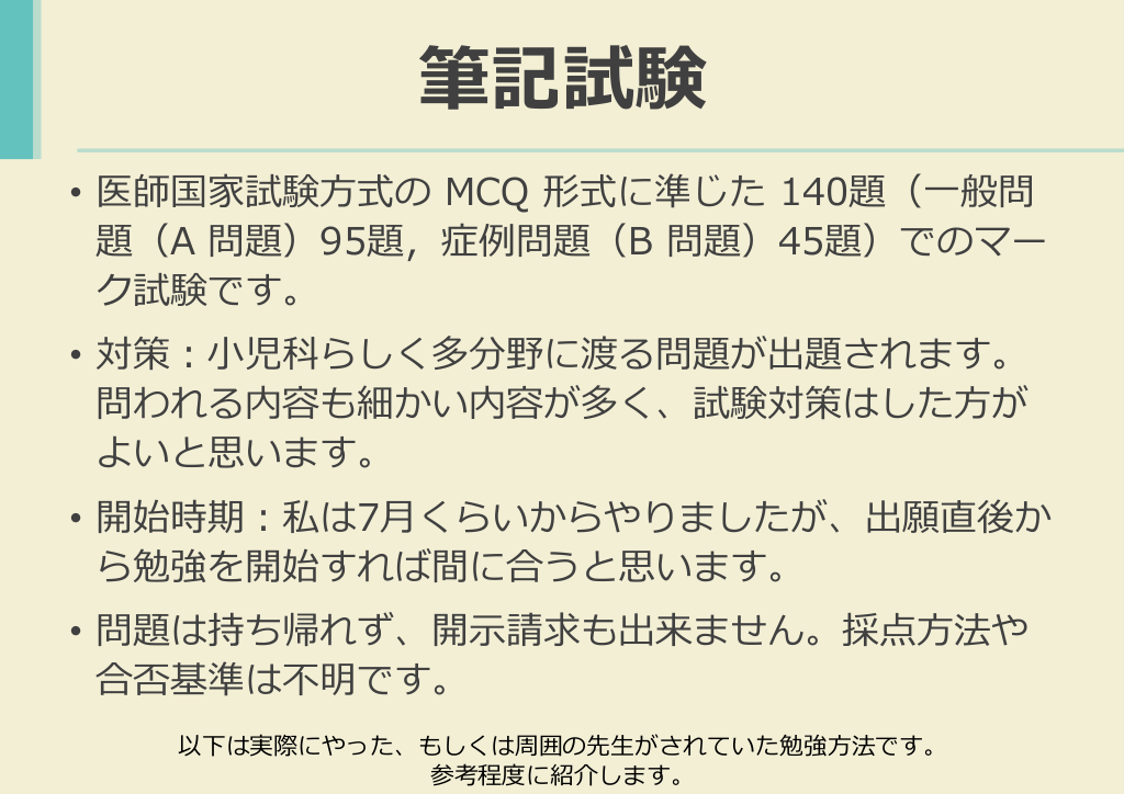 #13. 筆記試験 • 医師国家試験方式の MCQ 形式に準じた 140題(一般問 題(A 問題)95題,症例問題(B 問題)45題)でのマー ク試験です。 • 対策:小児科らしく多分野に渡る問題が出題されます。 問われる内容も細かい内容が多く、試験対策はした方が よいと思います。 • 開始時期:私は7月くらいからやりましたが、出願直後か ら勉強を開始すれば間に合うと思います。 • 問題は持ち帰れず、開示請求も出来ません。採点方法や 合否基準は不明です。 以下は実際にやった、もしくは周囲の先生がされていた勉強方法です。 参考程度に紹介します。