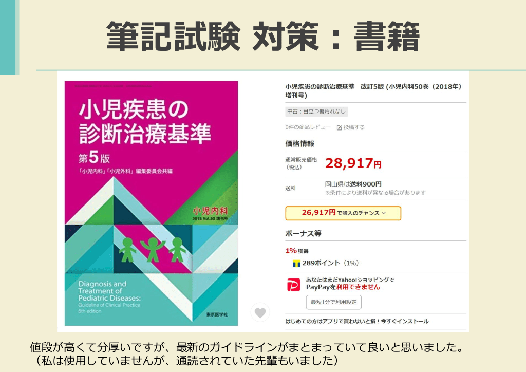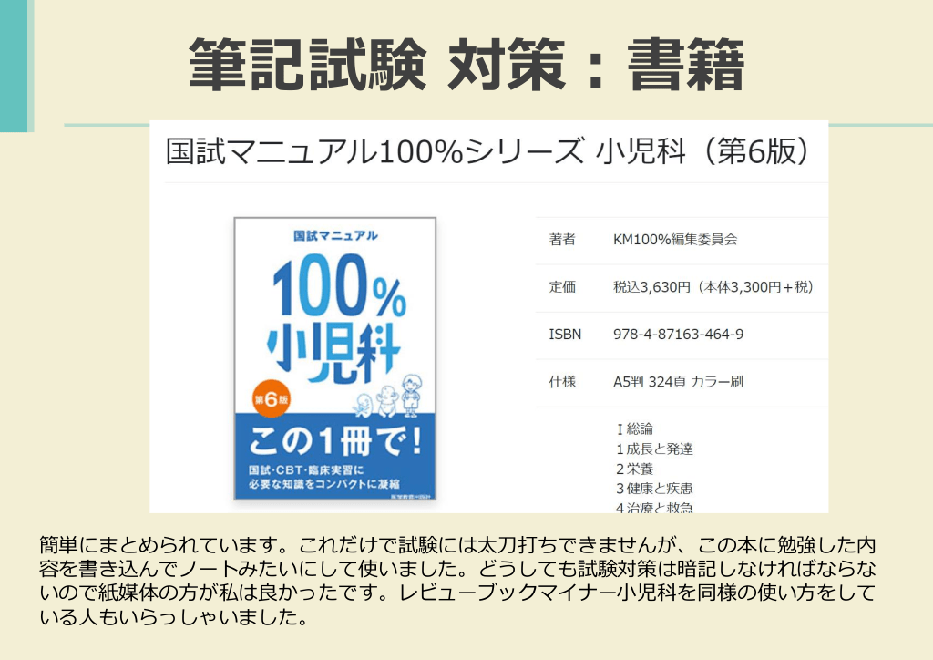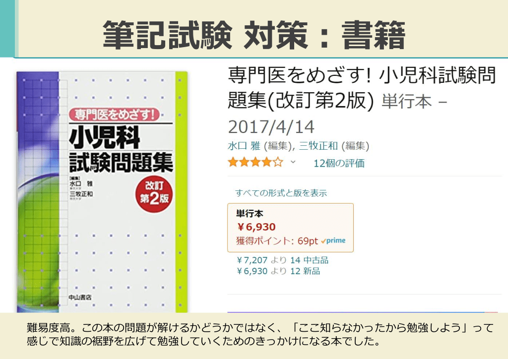 #15. 筆記試験 対策:書籍 簡単にまとめられています。これだけで試験には太刀打ちできませんが、この本に勉強した内 容を書き込んでノートみたいにして使いました。どうしても試験対策は暗記しなければならな いので紙媒体の方が私は良かったです。レビューブックマイナー小児科を同様の使い方をして いる人もいらっしゃいました。
