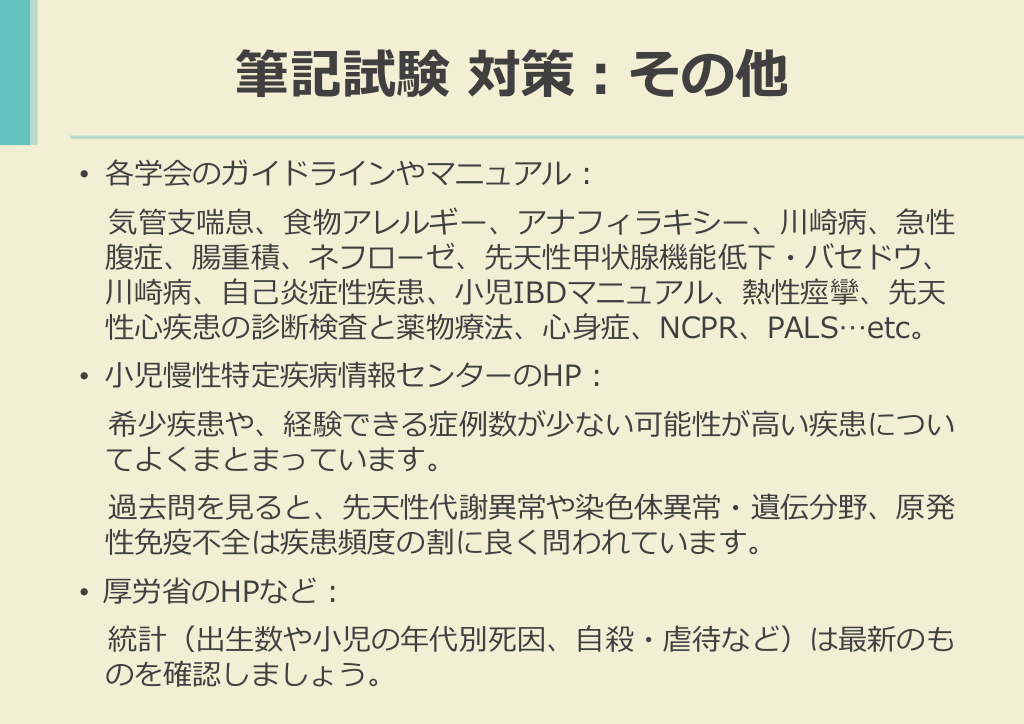 #17. 筆記試験 対策:その他 • 各学会のガイドラインやマニュアル: 気管支喘息、食物アレルギー、アナフィラキシー、川崎病、急性 腹症、腸重積、ネフローゼ、先天性甲状腺機能低下・バセドウ、 川崎病、自己炎症性疾患、小児IBDマニュアル、熱性痙攣、先天 性心疾患の診断検査と薬物療法、心身症、NCPR、PALS…etc。 • 小児慢性特定疾病情報センターのHP: 希少疾患や、経験できる症例数が少ない可能性が高い疾患につい てよくまとまっています。 過去問を見ると、先天性代謝異常や染色体異常・遺伝分野、原発 性免疫不全は疾患頻度の割に良く問われています。 • 厚労省のHPなど: 統計(出生数や小児の年代別死因、自殺・虐待など)は最新のも のを確認しましょう。