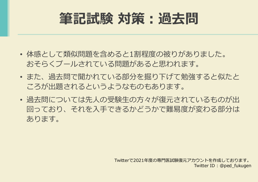 #18. 筆記試験 対策:過去問 • 体感として類似問題を含めると1割程度の被りがありました。 おそらくプールされている問題があると思われます。 • また、過去問で聞かれている部分を掘り下げて勉強すると似たと ころが出題されるというようなものもあります。 • 過去問については先人の受験生の方々が復元されているものが出 回っており、それを入手できるかどうかで難易度が変わる部分は あります。 Twitterで2021年度の専門医試験復元アカウントを作成しております。 Twitter ID : @ped_fukugen