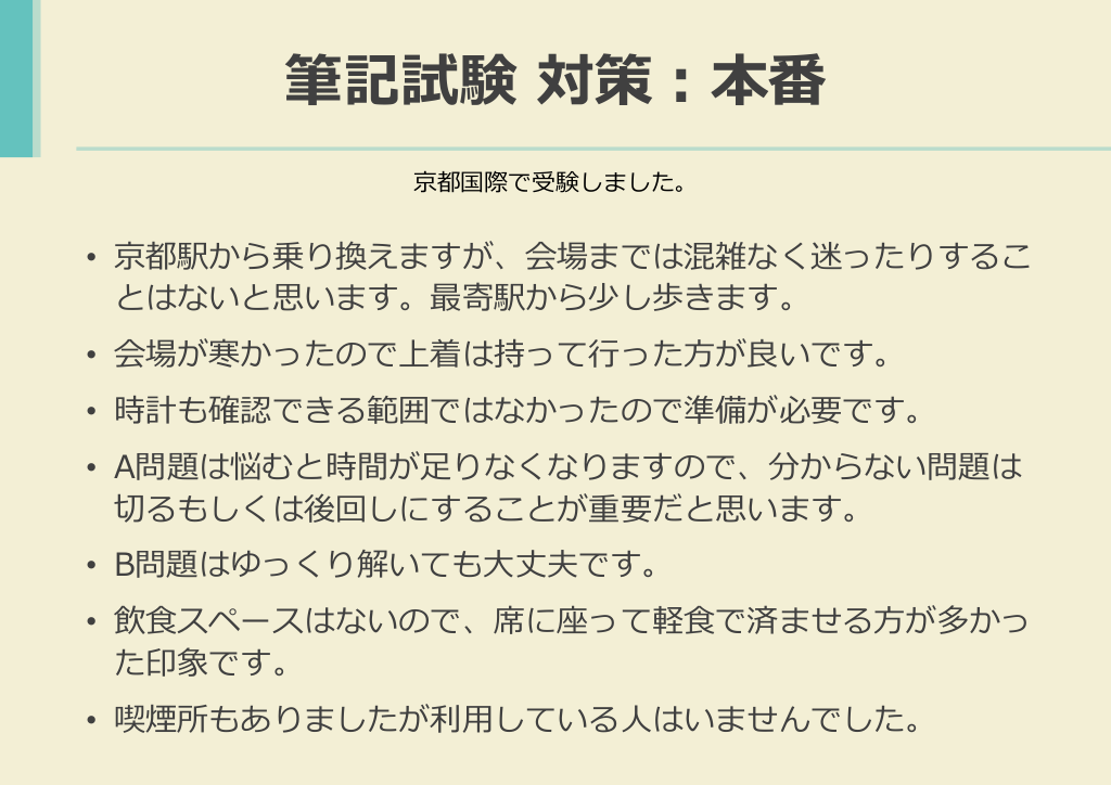 #19. 筆記試験 対策:本番 京都国際で受験しました。 • 京都駅から乗り換えますが、会場までは混雑なく迷ったりするこ とはないと思います。最寄駅から少し歩きます。 • 会場が寒かったので上着は持って行った方が良いです。 • 時計も確認できる範囲ではなかったので準備が必要です。 • A問題は悩むと時間が足りなくなりますので、分からない問題は 切るもしくは後回しにすることが重要だと思います。 • B問題はゆっくり解いても大丈夫です。 • 飲食スペースはないので、席に座って軽食で済ませる方が多かっ た印象です。 • 喫煙所もありましたが利用している人はいませんでした。
